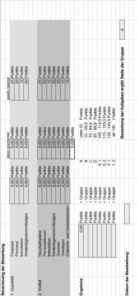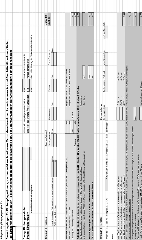 - Die Bewertung der Kirchenpfleger- und Kirchenpflegerinnenstelle erfolgt nach einem Punktesystem, in dem die dem Kirchenpfleger oder der Kirchenpflegerin übertragenen Dienstaufgaben entsprechend berücksichtigt sind. Zur Ermittlung der Punktezahl ist der als Anlage zu Vergütungsgruppenplan 63 veröffentlichte Bewertungsbogen zu verwenden.